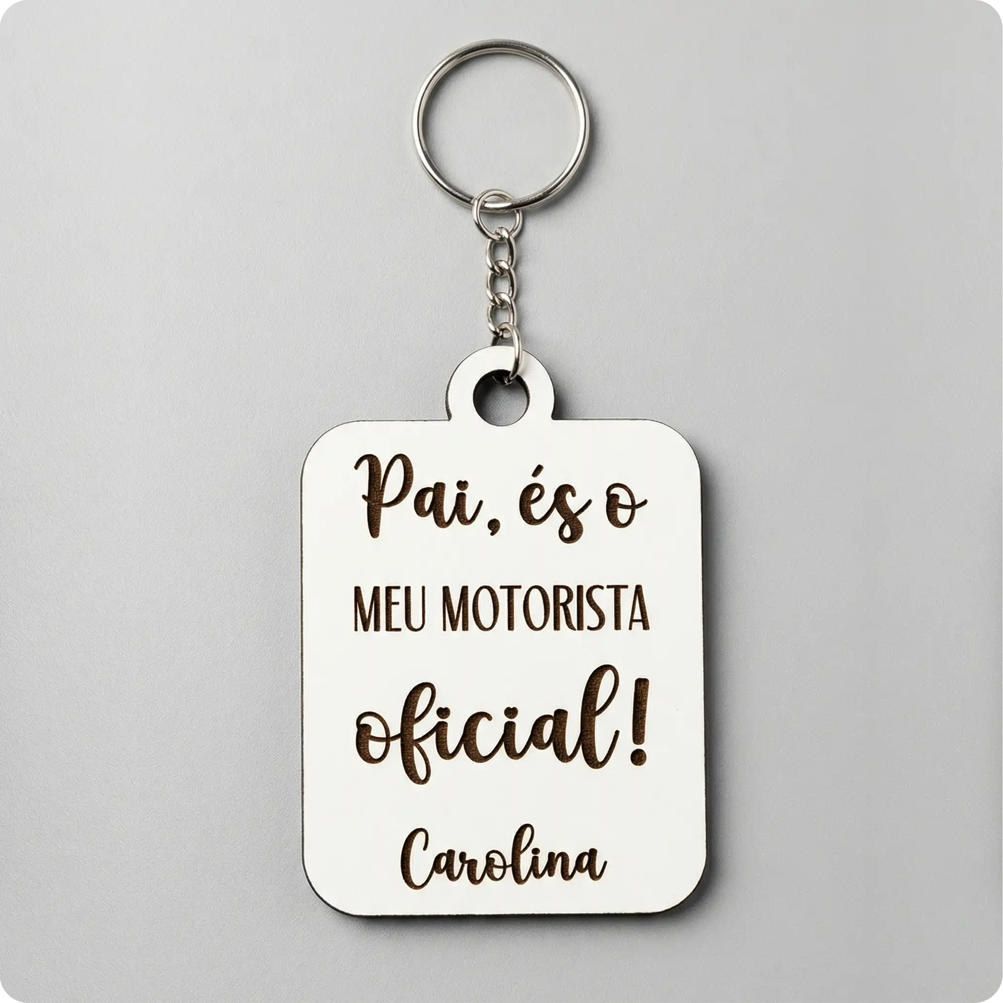 Sabemos que uma prenda do Dia do Pai tem de resistir ao uso diário. Fabricado em MDF branco de 3mm, este porta-chaves é super leve no bolso, mas extremamente resistente. Já vem totalmente montado e equipado com ferragens em metal prateado polido e durável — incluindo argola de ligação, corrente e uma argola principal robusta. É só embrulhar e oferecer!