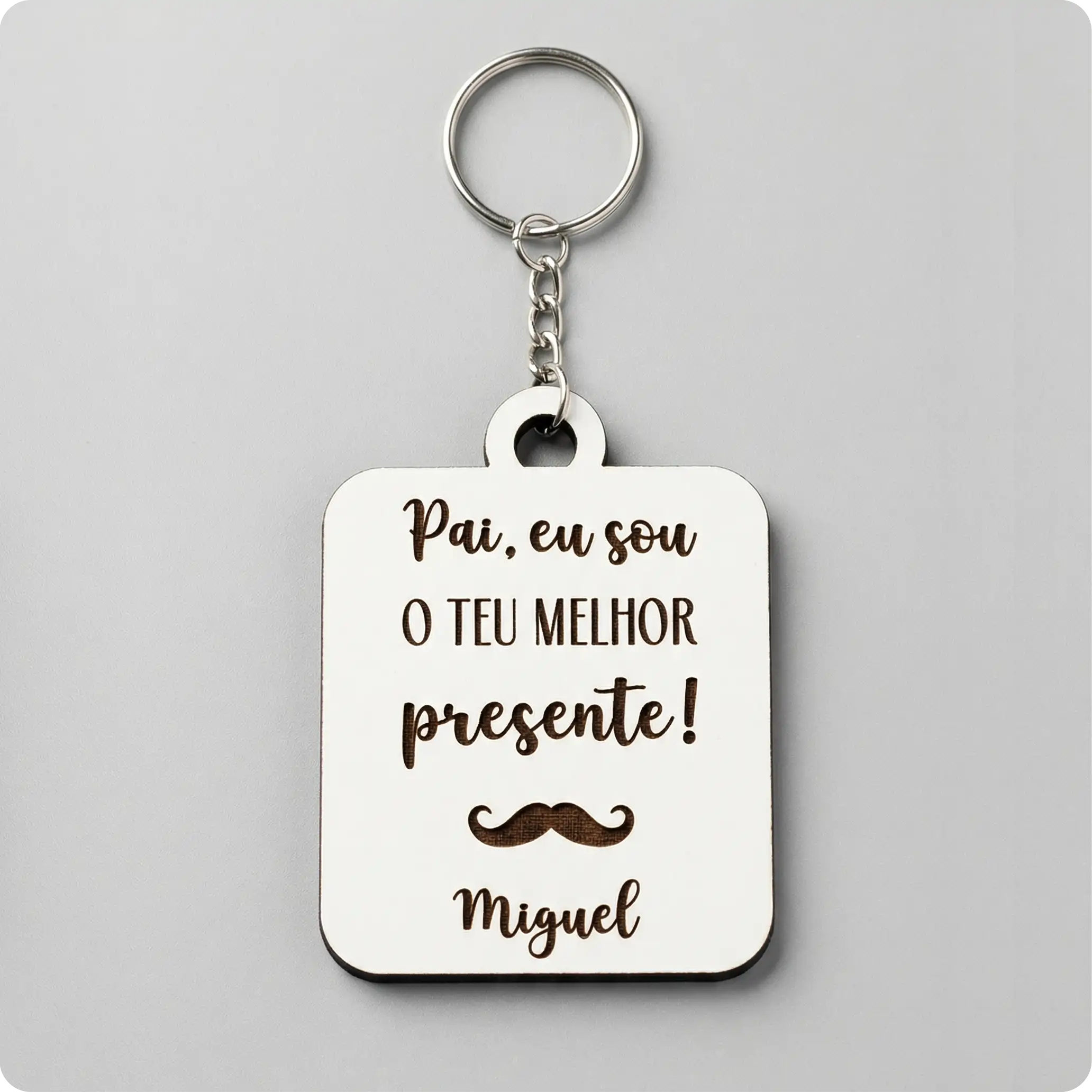 Sabemos que uma prenda do Dia do Pai tem de resistir ao uso diário. Fabricado em MDF branco de 3mm, este porta-chaves é super leve no bolso, mas extremamente resistente. Já vem totalmente montado e equipado com ferragens em metal prateado polido e durável — incluindo argola de ligação, corrente e uma argola principal robusta. É só embrulhar e oferecer!
