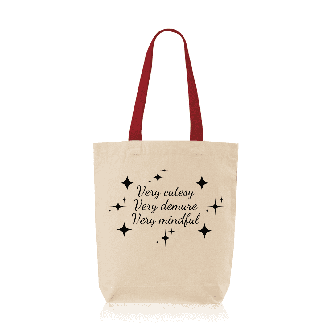 Transforma as tuas tarefas diárias numa experiência mais alegre e colorida com o nosso saco de pano – very demure com fole e alças coloridas.