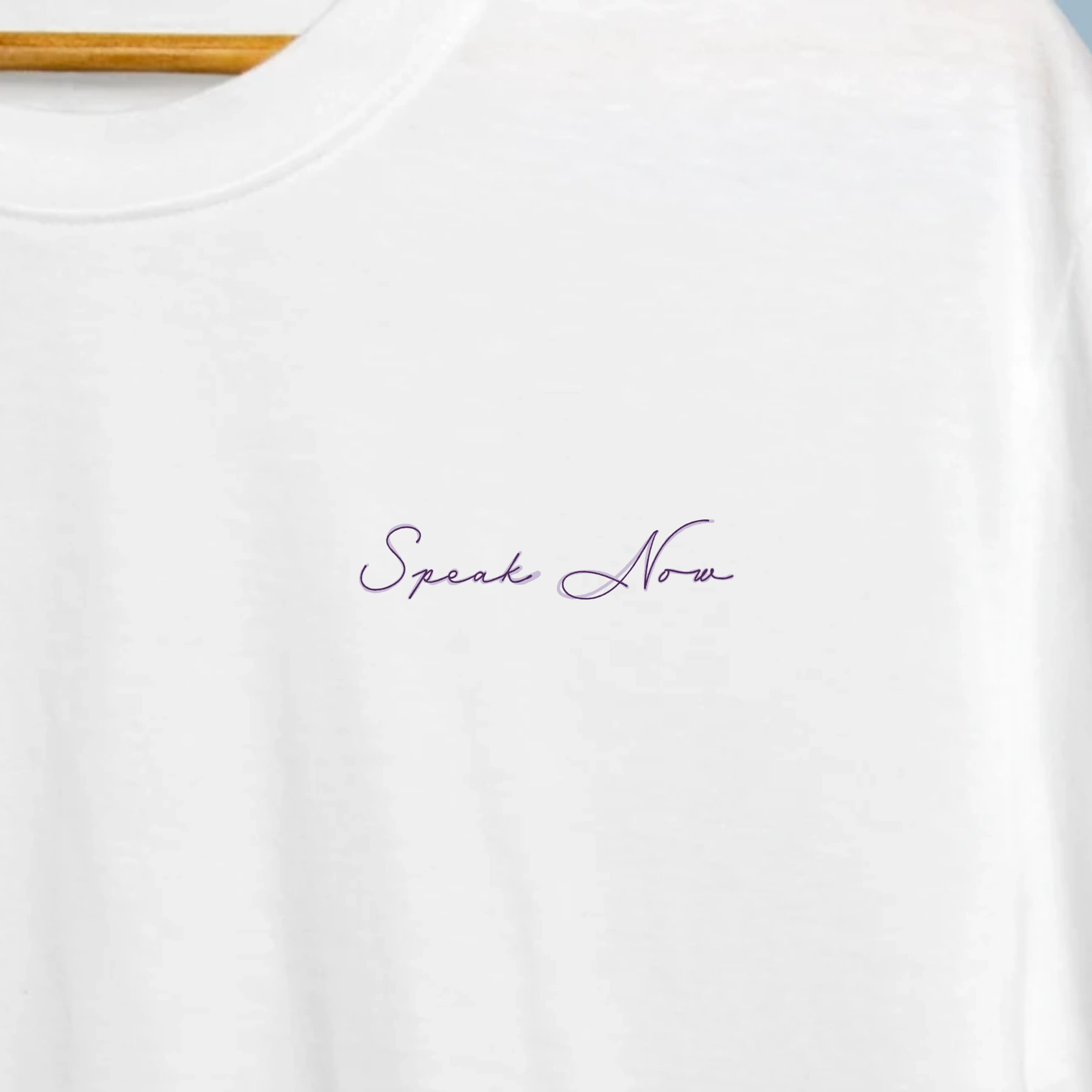 - ✍️ Assinatura cursiva ‘Speak Now’ em roxo suave no peito esquerdo — um detalhe delicado
