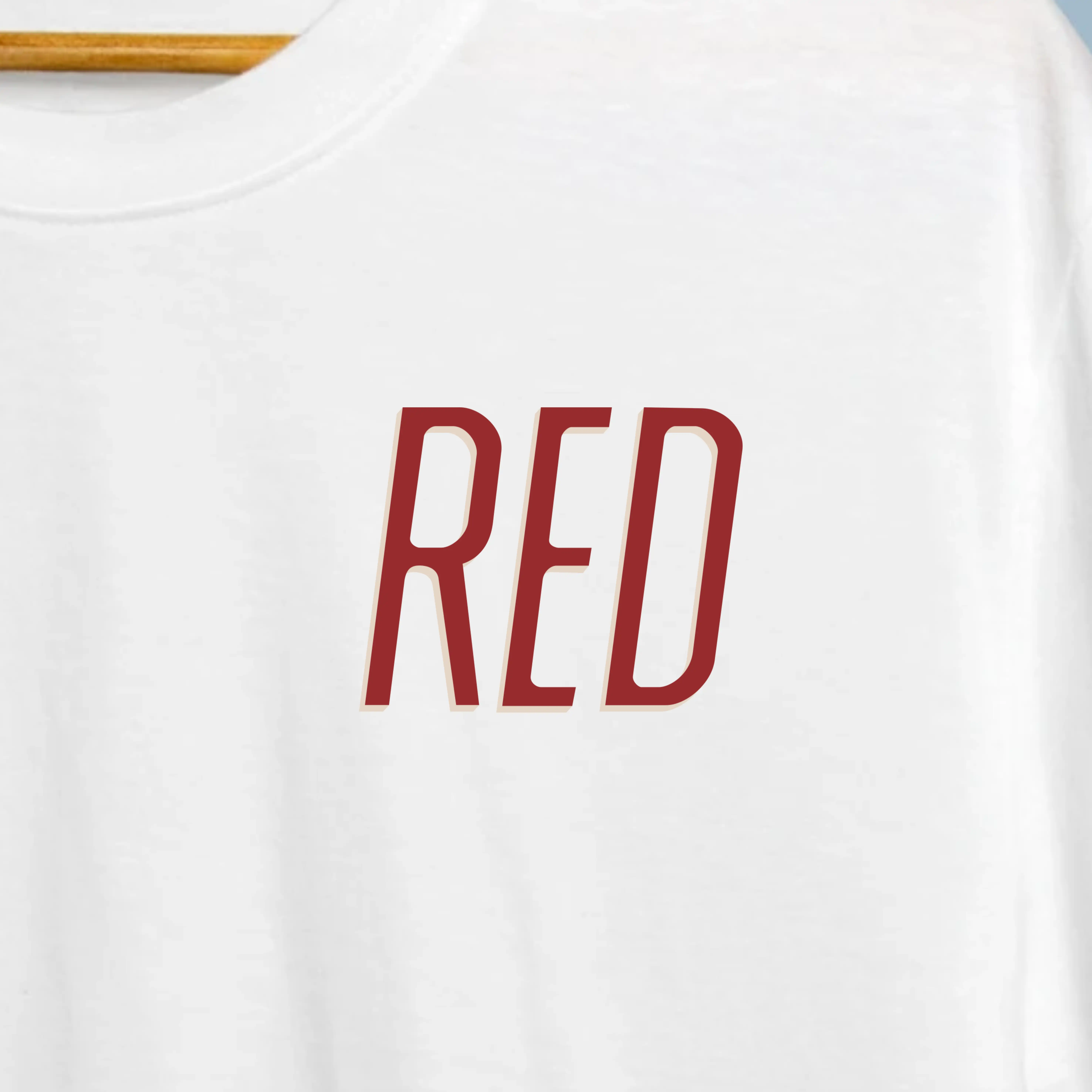 - ✍️ Tipografia ‘RED’ em bold vermelho escuro no peito esquerdo — marcante e icónica